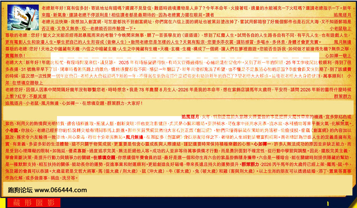 【1】.老總新年好!寫有信多封,寄送地址有錯嗎?遲遲不見登信,難道時過境遷物是人非了?今年本命年,火接著旺,適量的水能補充一下火旺嗎?還請老總指示一下。新年來臨,新氣象;還請老總不停派利是!相信讀者都是最期待的,因為老總實力擺在眼前。讀者